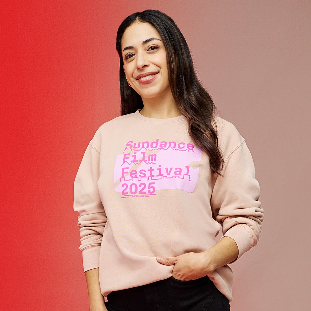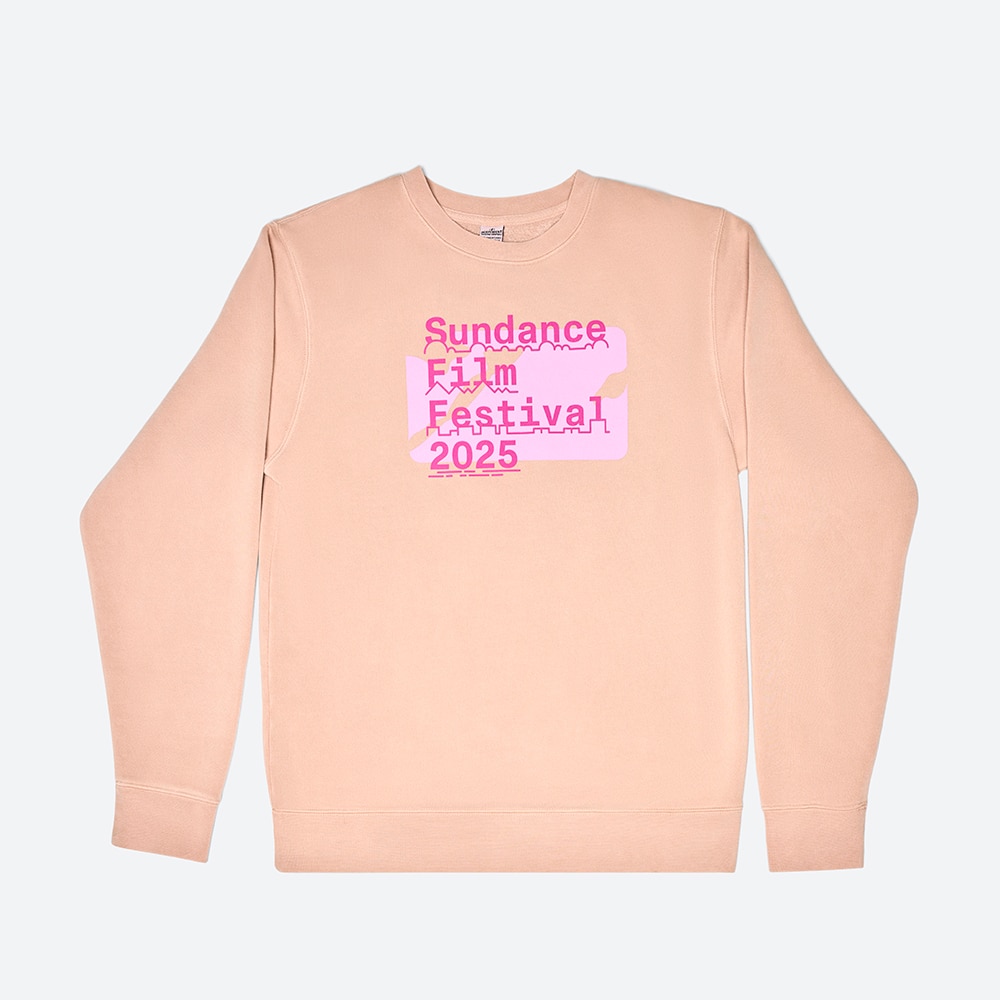 It’s refined yet playful! Perfect for any Fest moment, this long sleeve soft pink crew with “Sundance Film Festival 2025” and our Sundanscape — depicting whimsical clouds, mountains, buildings, and lakes — in vivid pink across the chest looks simultaneously subtle and striking.